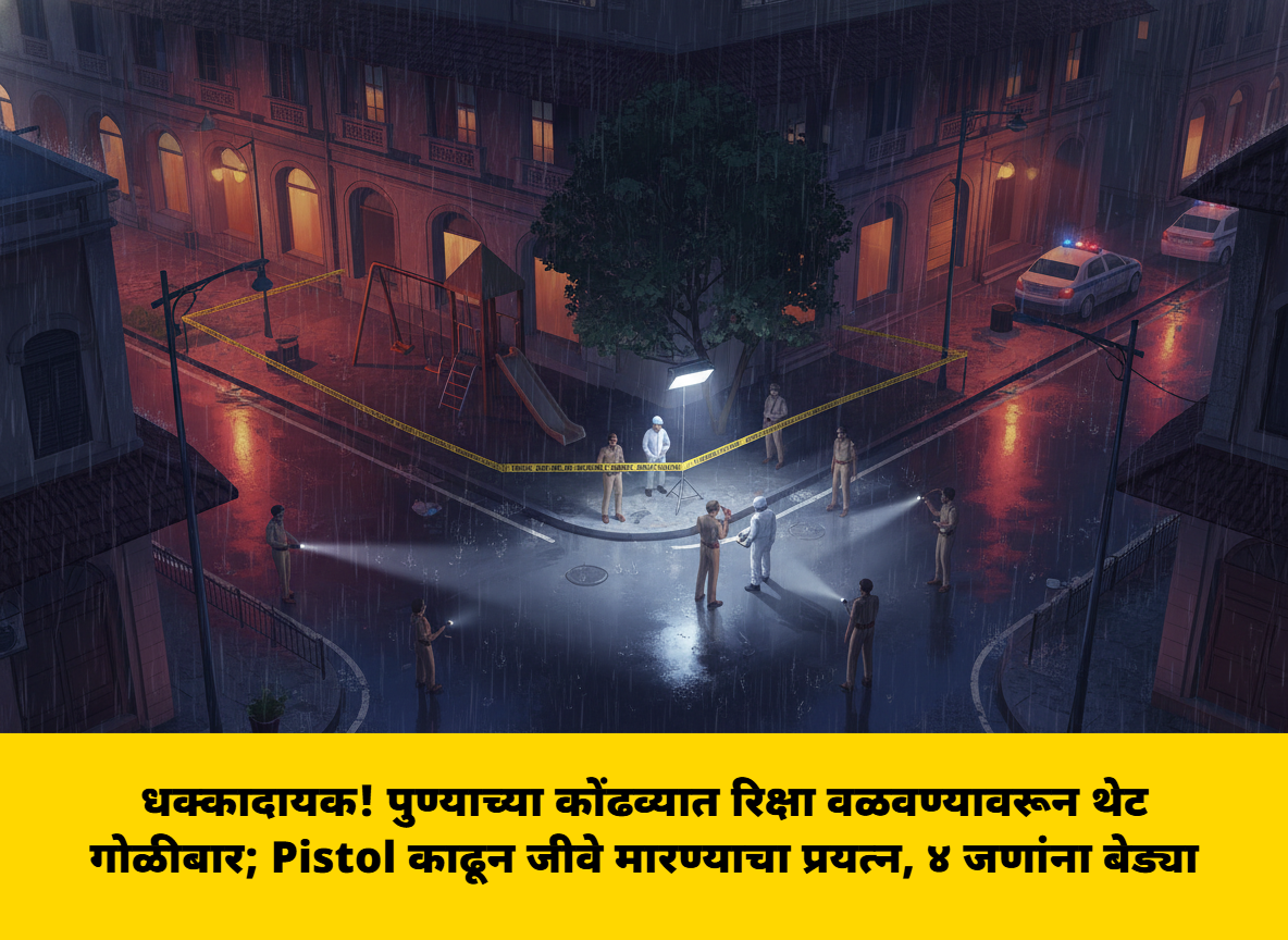 पुणे शहरात किरकोळ वादातून टोकाची पावलं उचलण्याच्या घटनांमध्ये मोठी वाढ झाली आहे. पुण्याच्या कोंढवा परिसरात एका ४८ वर्षीय व्यक्तीवर रिक्षा वळवण्यावरून झालेल्या वादातून थेट पिस्टलने गोळीबार करण्यात आला आहे. या धक्कादायक घटनेमुळे परिसरात एकच खळबळ उडाली असून कोंढवा पोलिसांनी तात्काळ कारवाई करत ४ गुंडांच्या मुसक्या आवळल्या आहेत. मध्यरात्रीच्या सुमारास घडलेल्या या थराराने ‘Pune Crime’ विश्वात पुन्हा एकदा दहशतीचे वातावरण निर्माण झाले आहे.