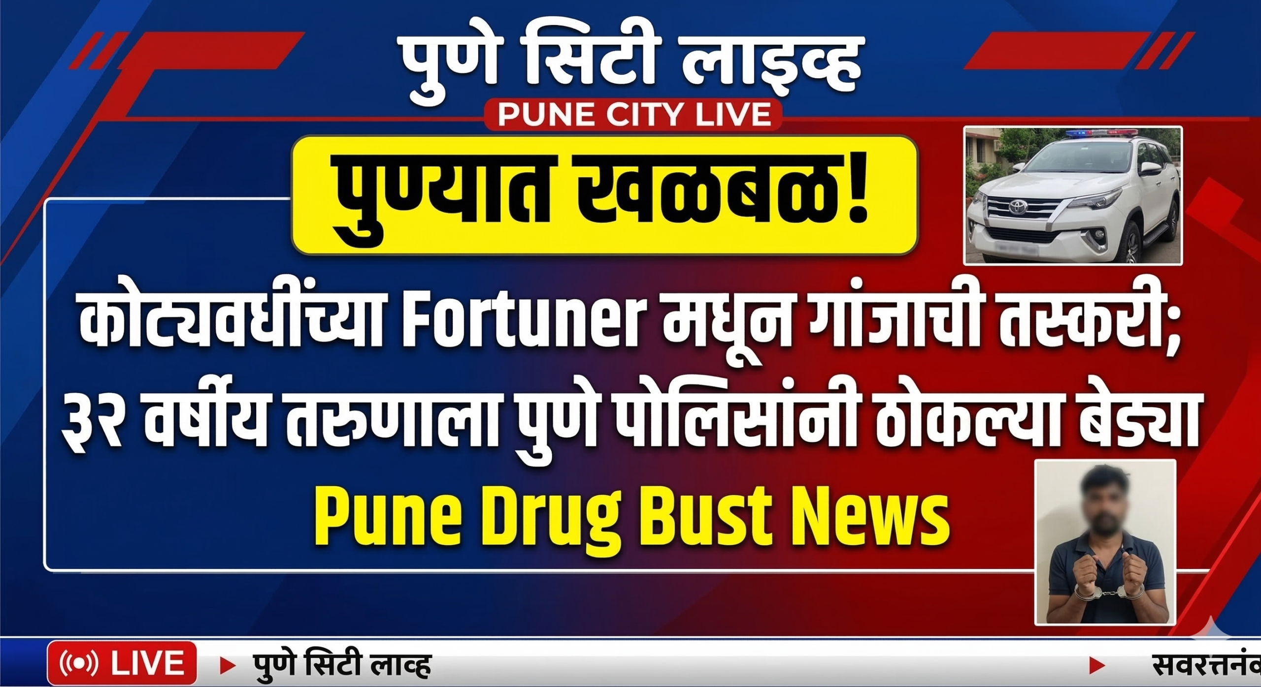 पुण्यात खळबळ! कोट्यवधींच्या Fortuner मधून गांजाची तस्करी; ३२ वर्षीय तरुणाला पुणे पोलिसांनी ठोकल्या बेड्या, Pune Drug Bust News