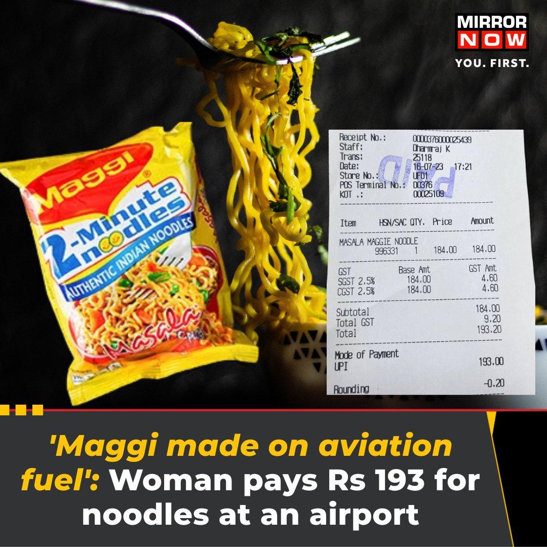 मुंबई, 17 जुलै 2023: एका YouTuberने नुकतेच एका विमानतळावर 193 रुपयांना Maggi नूडल्स खरेदी केल्याचे सांगितले आहे. तिने सोशल मीडियावर एक बिल शेअर केले आहे ज्यामध्ये ती 184 रुपये Maggi नूडल्स आणि 9.20 रुपये जीएसटीसाठी भरलेली आहे.